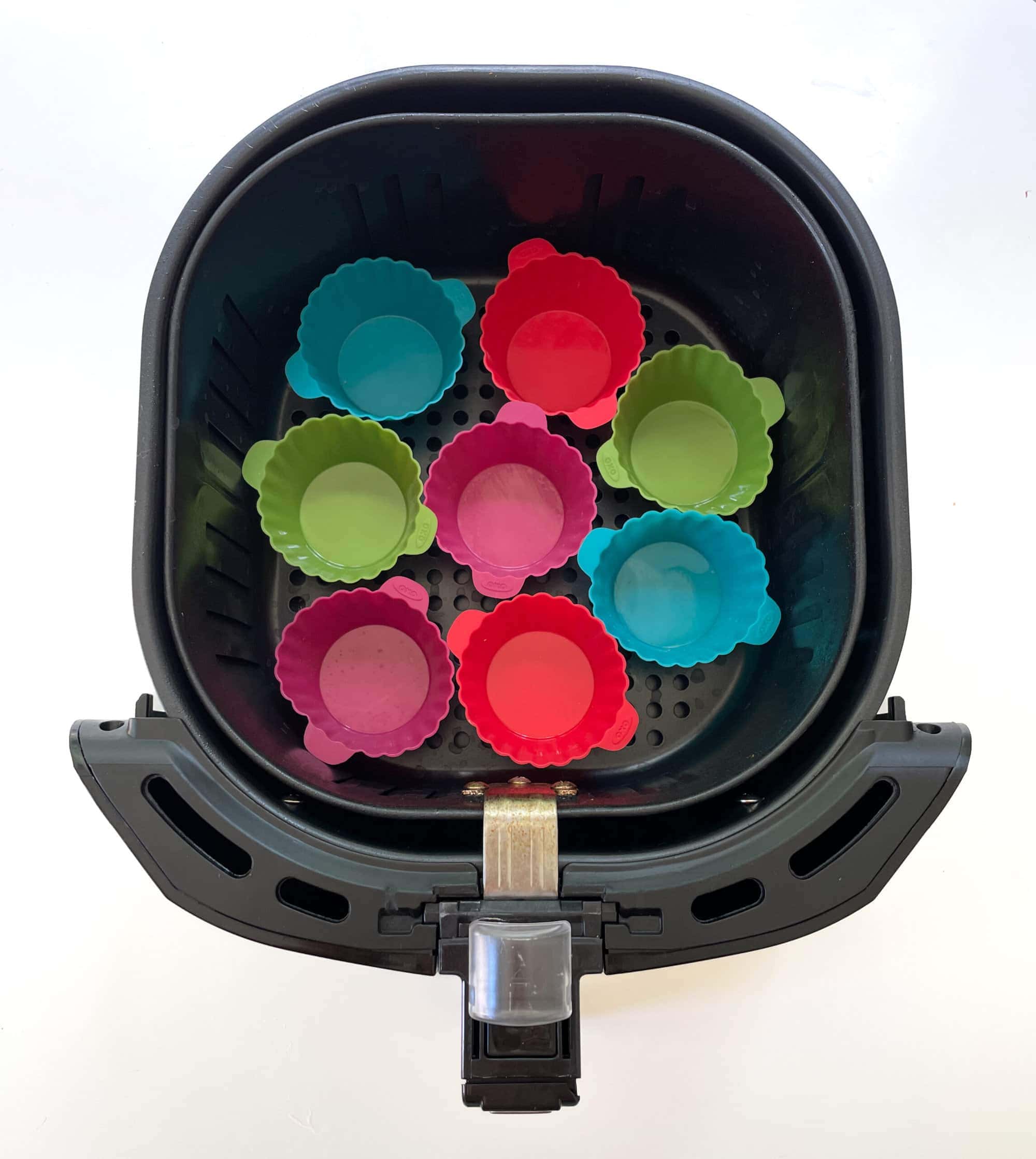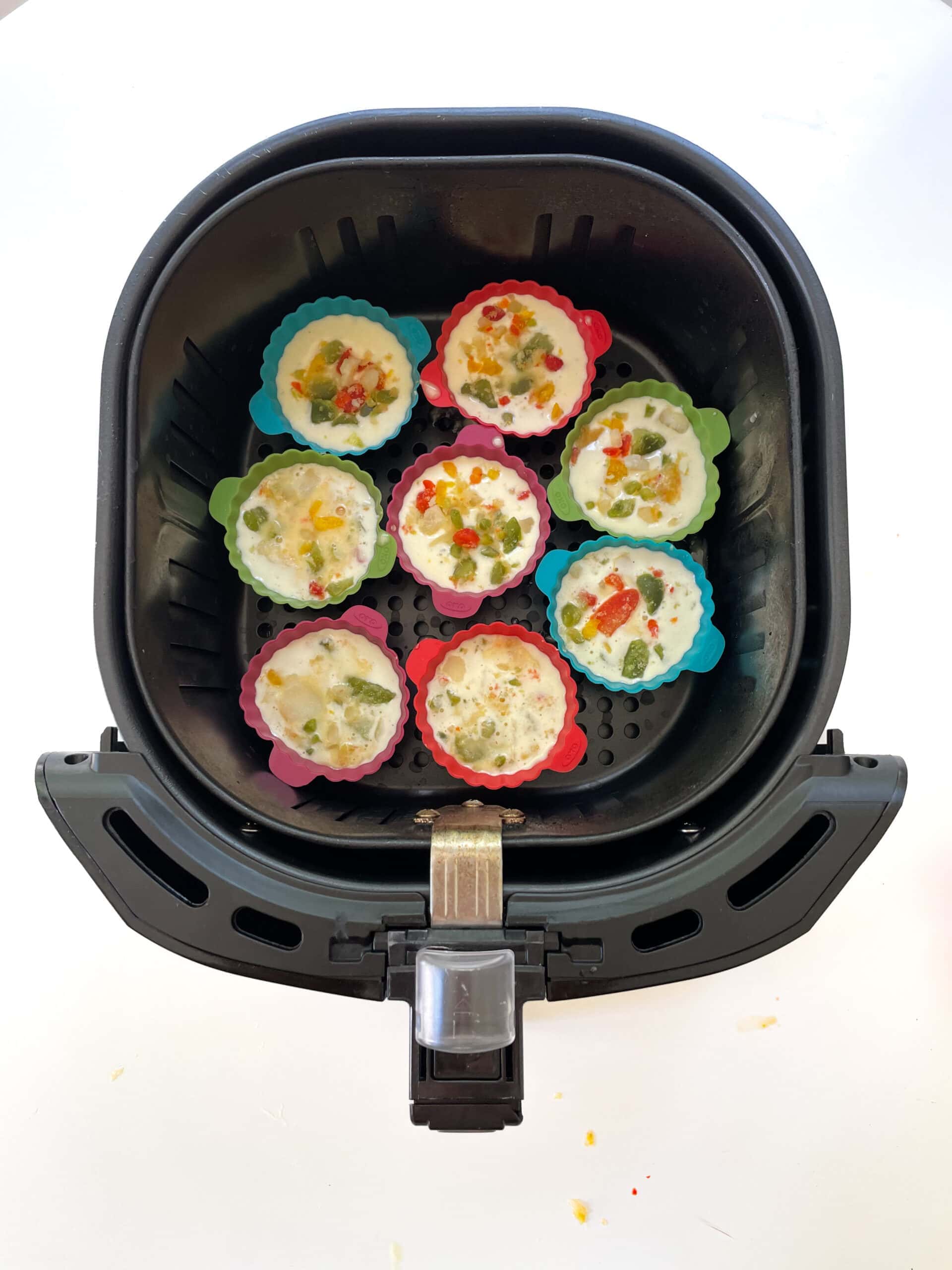 Place the silicone molds in your air fryer and divide the egg mixture across your molds.