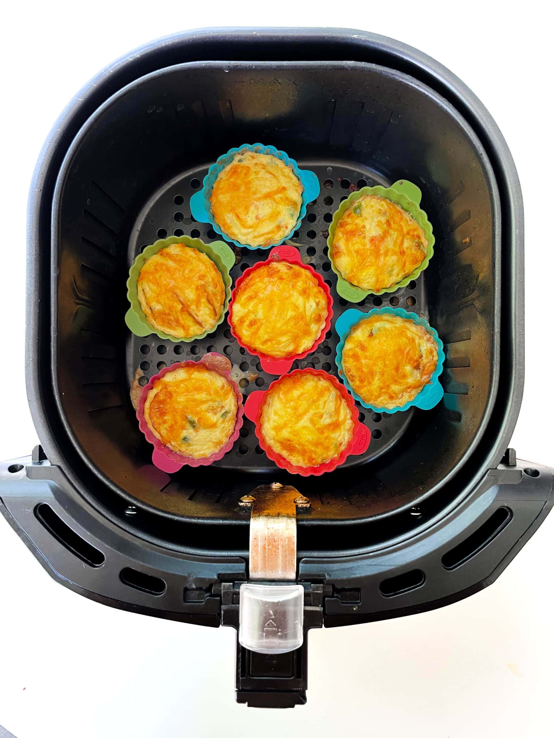 - Cook in the air fryer for 5 minutes, stir, and cook another 8 minutes. Cook just until eggs are set (they will continue cooking a little bit once removed. Rest 5 minute before removing from molds.